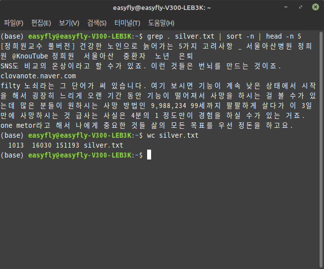 1013줄이 되는 긴 문서인 'silver.txt' 파일을 빈 줄을 제외하고 가나다 순으로 정렬하여 위로 5줄을 디스플레이하고자 합니다.