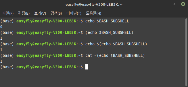- 네 번째 명령:이 명령은 프로세스 치환(process substitution)을 사용합니다. <(...) 구문은 하위 셸에서 명령을 실행하고 그 출력을 파일처럼 취급합니다. 여기서 echo $BASH_SUBSHELL은 하위 셸에서 실행되어 1을 출력하고, cat 명령은 그 결과를 읽어서 표시합니다.