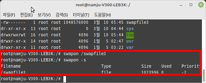 - 스왑 파일을 시스템에 인식할 때와 마찬가지로 스왑 파티션 /dev/sdc를 활성화한다. 정상 수행되었는지 확인하려면 'swapon -s' 명령어를 사용한다.
