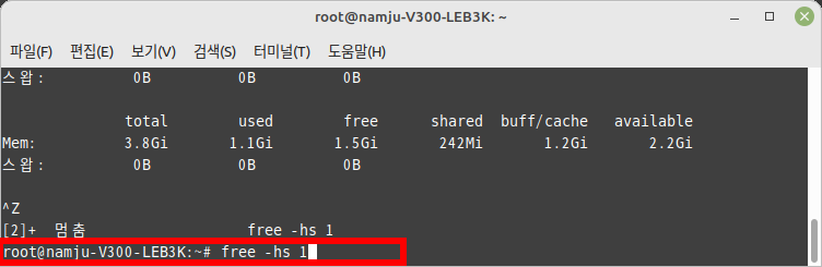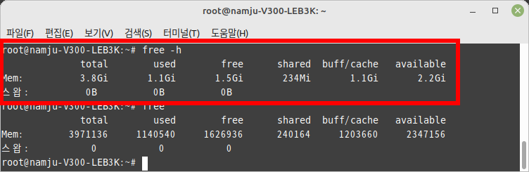 - 물리 메모리의 사용량, 스왑 메모리 사용량, 커널의 메모리 사용량, 사용 가능한 메모리 양 등 메모리의 사용 상태를 출력하는 명령어이다. buffer/cache나 swap의 미사용 중인 메모리가 부족한 경우 메모리 업그레이드를 고려해야 한다. 이 메모리가 부족하면 잦은 하드디스크 접근이 발행하고 성능 저하로 이어진다.