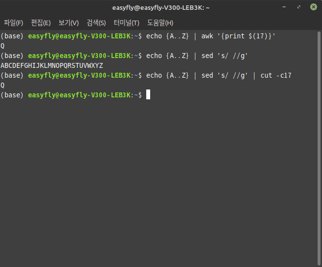 각 명령어는 알파벳 문자열을 처리하며, 다양한 텍스트 처리 도구(awk, sed, cut)를 사용하여 특정 데이터를 조작하고 추출하는 방법을 보여줍니다. 이 명령어들은 리눅스에서 텍스트 조작을 수행하는 방법의 좋은 예시입니다.