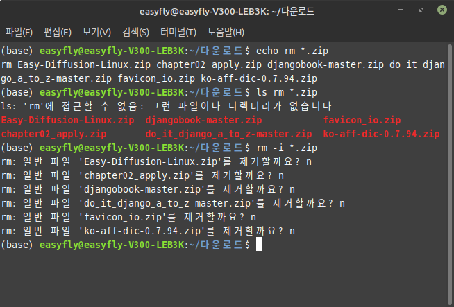 .zip파일을 삭제합니다. rm *.zip- 강제로 파일 삭제: