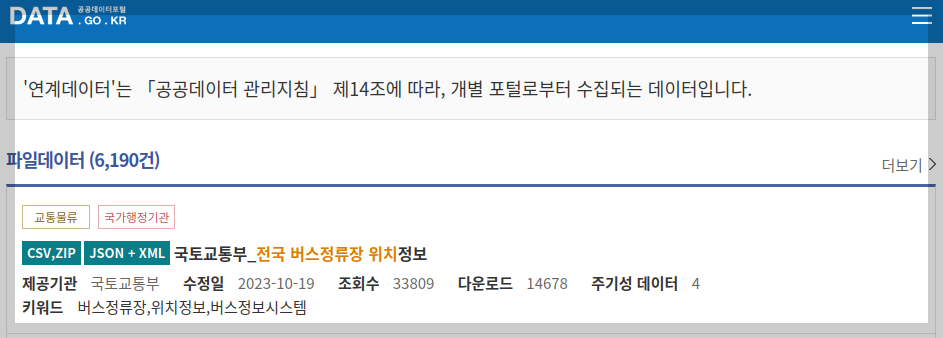 국토교통부에서 제공하는 전국 버스정류장 위치 정보를 다운로드합니다. '공공데이터 포털'에 '전국버스정류장 위치'를 검색했더니 제일 위로 올라오는 파일데이터가 '국토교통부_전국 버스정류장 위치 정보'군요.
