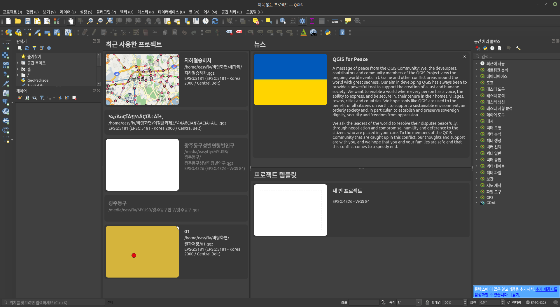 다음과 같이 QGIS가 실행되면서 초기 화면이 나옵니다. 업데이트를 통한 프로그램은 최신 버전은 아니군요. LTR 3.22 버전이 로딩됩니다.