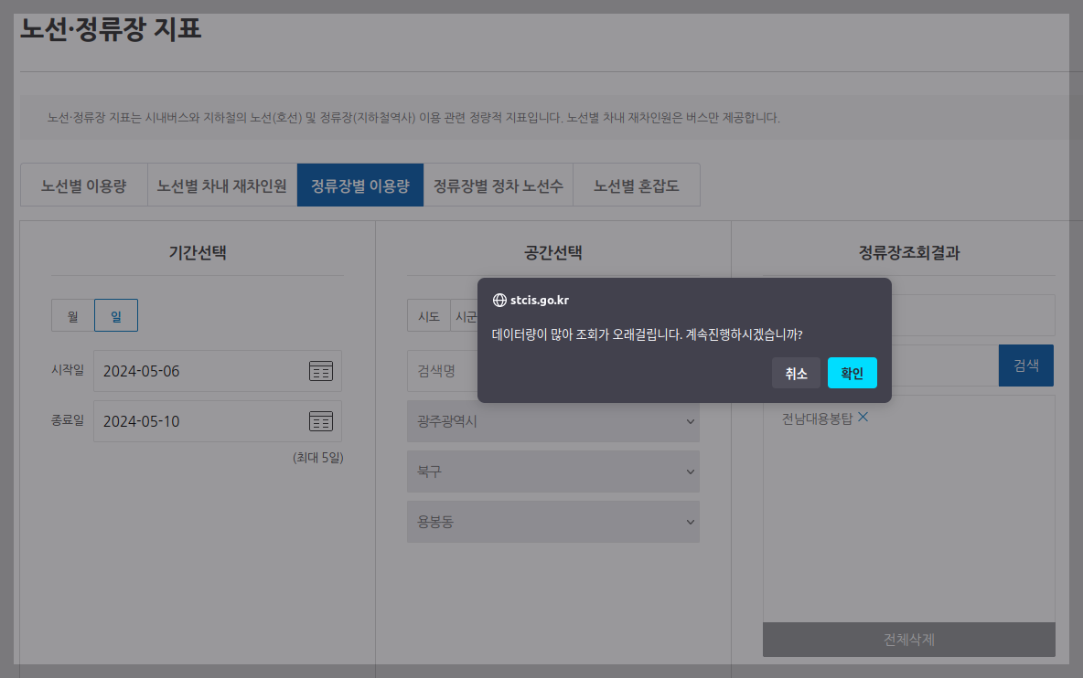 공공데이터 포털을 통해 '노선과 정류장 지표'를 찾아 찾고자 하는 '전남대 용봉탑' 정류장 정보를 검색했습니다. 데이터를 조회하는데 시간이 많이 소요됐습니다. 하긴 제가 사용하는 리눅스 시스템의 메모리가 4GB 밖에 되지 않는 저급한 시스템이라 지리정보를 조회하기에는 무리군요.