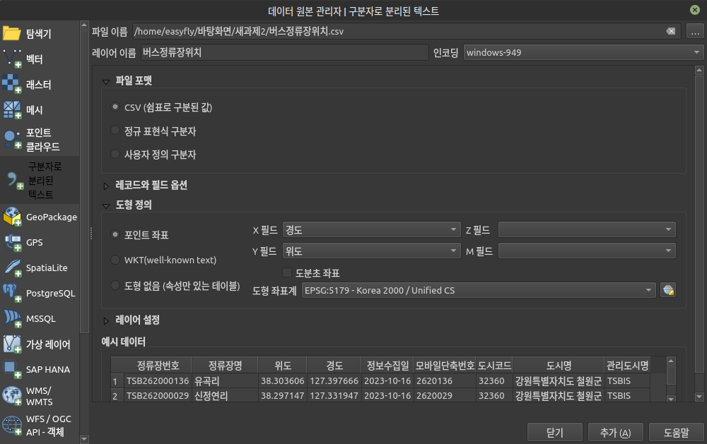 파일을 다운로드해서 프로그램에서 CSV파일로 불러옵니다. '레이어 > 레이어추가 > 구분자로 분리된 텍스트 레이어 추가'를 통해 내려받은 파일을 올립니다.