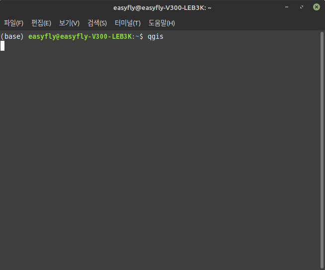 전국 버스정류장 위치 정보를 QGIS에 올려 봅니다. 우선 qgis 프로그램을 실행합니다. 리눅스에서 실행하는 방법은 여러 가지가 있는데, 그중 하나는 터미널에서 아래와 같이 'qgis' 명령으로 실행하는 방법도 있습니다.