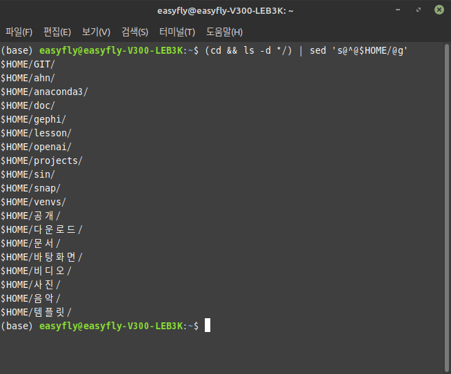 s@^@$HOME/@g: 줄의 시작(^)을$HOME/로 대체합니다.@는 구분자로 사용되어^와$HOME/을 구분합니다.