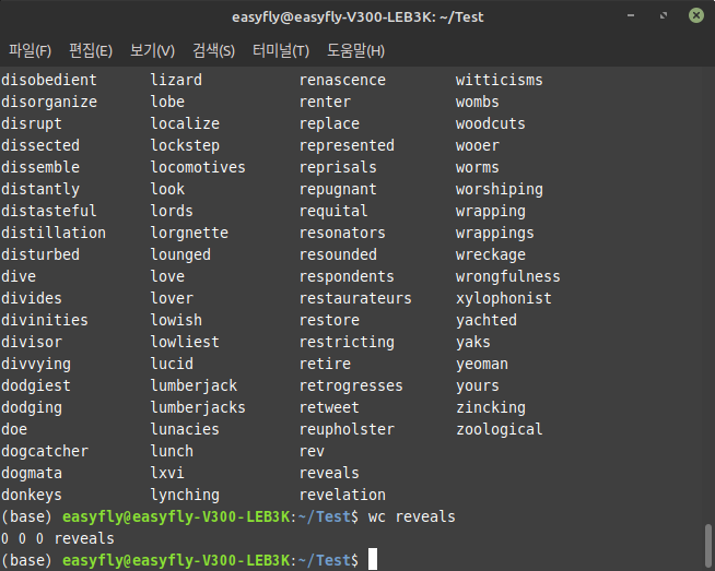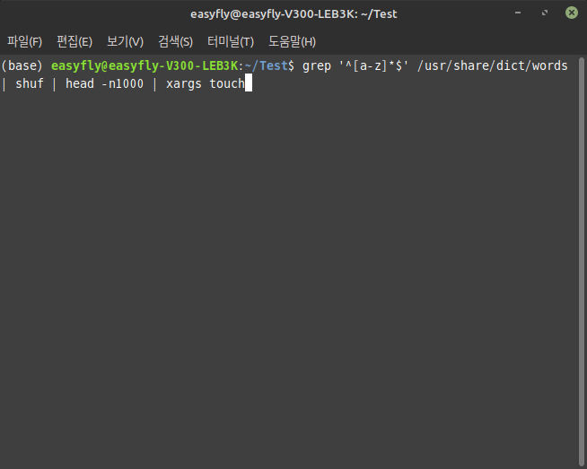 grep명령어로 특정 패턴의 단어를 필터링합니다.shuf명령어로 필터링된 결과를 무작위로 섞습니다.head명령어로 섞인 결과 중 처음 1000개의 라인을 선택합니다.xargs와touch명령어로 선택된 단어들을 파일 이름으로 사용하여 빈 파일을 생성합니다.