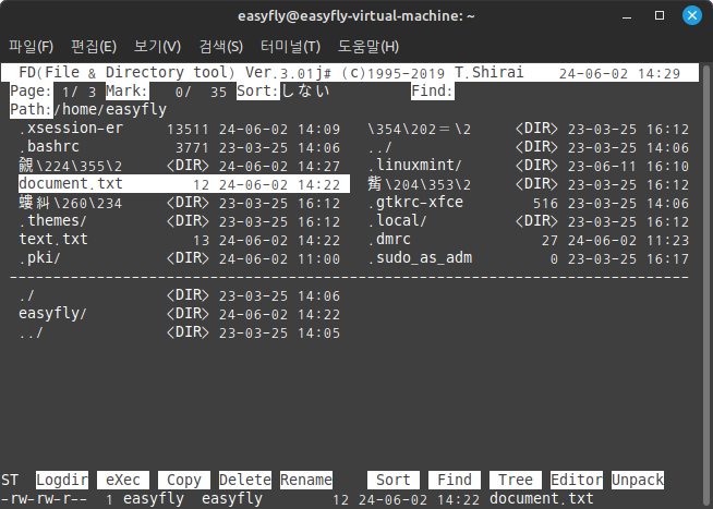 FD (File & Directory tool)는 파일 관리 도구를 사용하고 있는 화면입니다. 이 도구는 파일과 디렉터리를 탐색하고 관리하는 데 유용합니다. 다음은 주요 기능과 사용 방법에 대한 설명입니다.