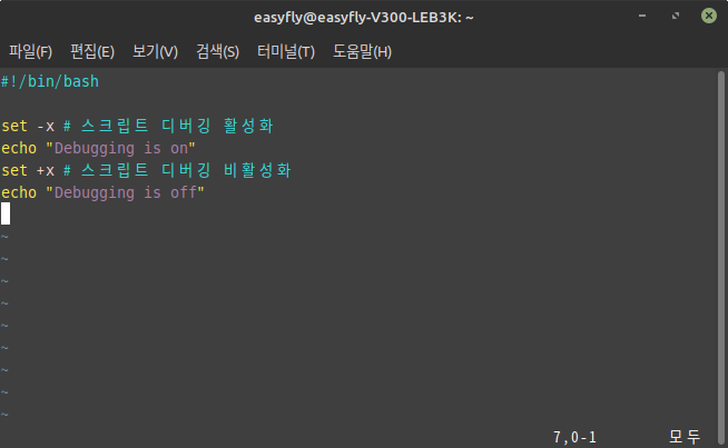 스크립트의 디버깅을 위해 set 명령어를 사용할 수 있습니다.