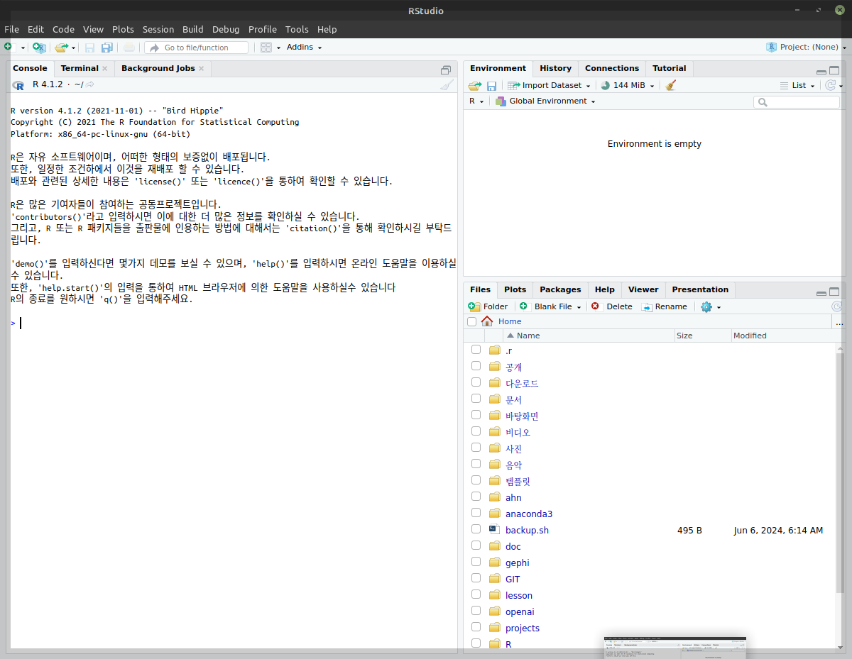 cd ~/Downloads 또는 cd ~/다운로드 - 다음 명령어를 입력하여 RStudio를 설치합니다.