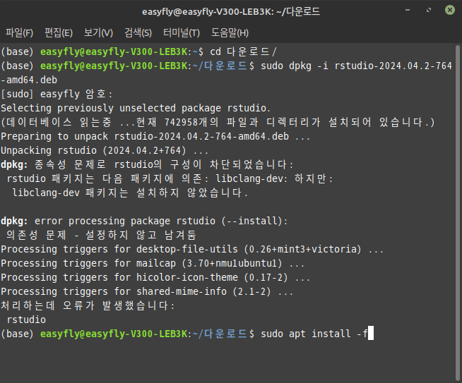 sudo dpkg -i rstudio-2024.04.2-764-amd64.deb - 종속성 문제 해결을 위해 추가로 다음 명령어를 실행합니다.
