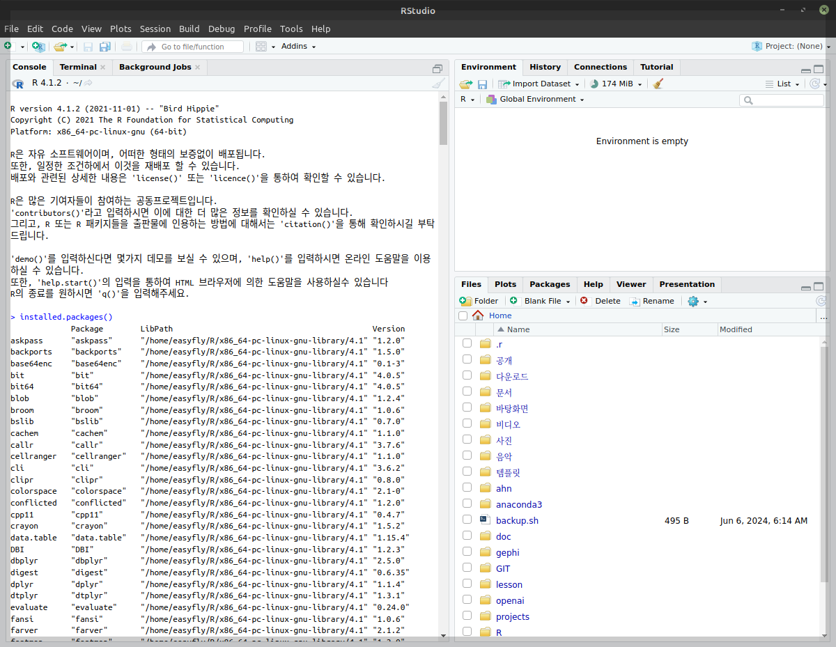 RStudio는 다음과 같이 기능이 나눠진 몇 개의 패널이 있습니다. 왼편 'Console 패널'은 'Console', 'Terminal', 'Background Jobs' 탭으로 구성되어 있습니다.