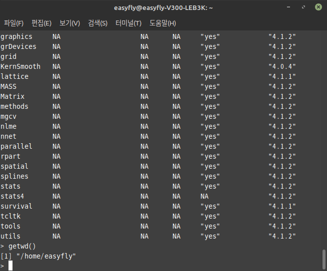 R은 작업 환경이 터미널이기 때문에 윈도즈에 길들여진 사용자는 사용이 불편합니다. 물론 리눅스 터미널에 익숙한 사용자는 터미널에서 작업도 순조롭습니다. 아래와 같이 현재 작업 디렉터리를 확인하는 'getwd()'로 확인하면 작업 디렉터리를 볼 수 있습니다. 'setwd("...")' 명령으로 작업 디렉터리를 원하는 디렉터리로 설정할 수 있습니다.