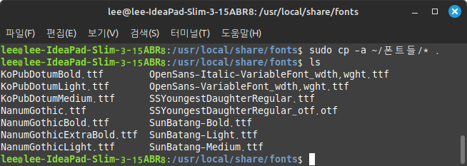 sudo cp ~/Downloads/nanum-gothic/*.ttf /usr/local/share/fonts