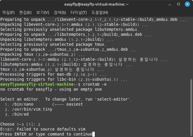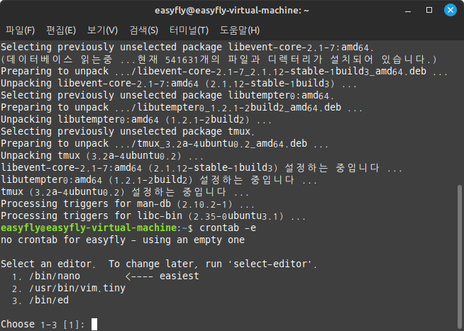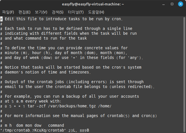 - 터미널을 열고 crontab -e 명령어를 입력하여 편집기에서 crontab 파일을 엽니다.