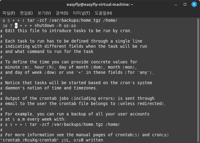 파일의 상단에는 주석으로 사용 방법이 설명되어 있습니다. 주석을 제외한 부분에 실제 작업을 정의할 수 있습니다. 여기서는 주석 상단에 두 가지 자동 작업을 지시하려고 합니다. 하나는 매주 한 번 백업을 하는 것과 매일 7시 30분에 셧다운을 예약하고 30분 후에 시스템을 끄는 것을 입력하려고 합니다.