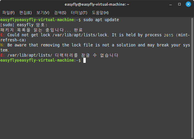 sudo rm /var/lib/apt/lists/lock명령으로 잠금 파일을 삭제합니다. sudo apt update명령으로 시스템 업데이트를 재시도합니다.