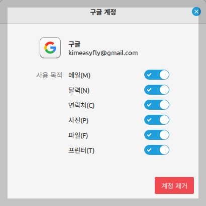 GNOME 온라인 계정 창이 열리면, 'Google'을 선택하여 Google 계정을 추가합니다. Google 계정 이메일 주소와 비밀번호를 입력하여 로그인합니다. 필요한 권한을 허용합니다.