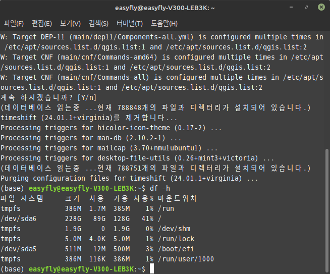 마지막으로, 디스크 사용량을 확인하여 TimeShift 관련 파일들이 제대로 삭제되었는지 확인합니다.
