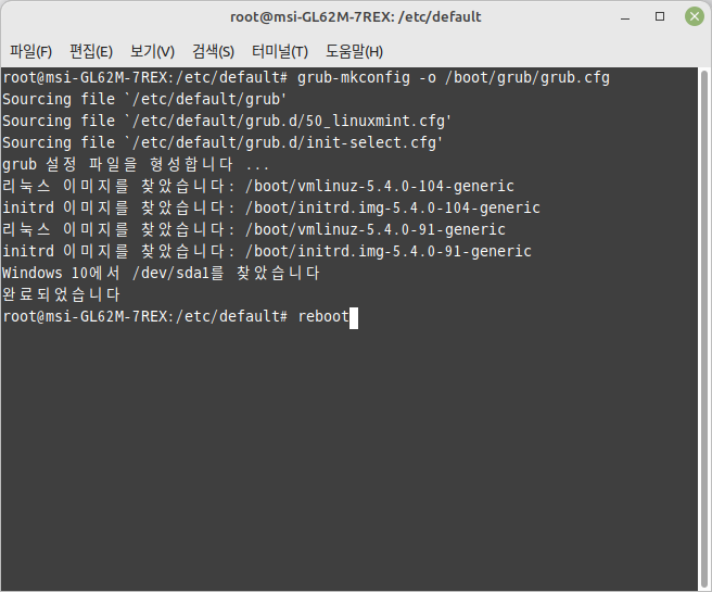리부팅을 해야 변경된 grub 환경이 적용됩니다. 리부트 방법은 여러 가지 있는데 대표적인 것은 'reboot'입니다. 또는 'init 6'로 리부팅할 수도 있습니다. 시스템을 껐다 다시 부팅해도 됩니다.