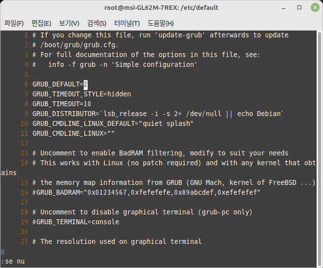 root관리자 모드로 /etc/defautl/grub 편집