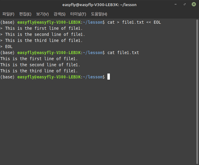 이 명령어를 실행하면 file1.txt 파일이 생성되고, 지정된 여러 줄의 내용이 파일에 기록됩니다.