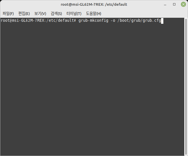 grub 환경 파일은 /boot/grub/grub.cfg입니다. 이 환경 파일을 변경하기 위해서 사용되는 명령어는 'grub-mkconfig'입니다. 'grub-mkconfig -o /boot/grub/grub.cfg'로 변경이 이뤄집니다.