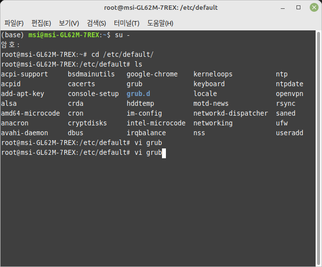 먼저 /etc/default/grub 파일을 편집합니다. 편집기는 리눅스 대표 편집기 'vi'를 사용했습니다.
