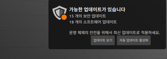 현재 시스템에 적용 가능한 업데이트가 있다는 알림입니다. 총 15개의 보안 업데이트와 18개의 소프트웨어 업데이트가 준비되어 있으며, 운영 체제의 안전과 소프트웨어의 안정성을 위해 최신 업데이트를 적용하는 것이 좋습니다.