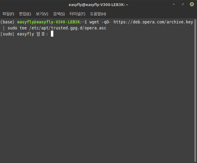 다음으로, Opera 저장소를 리눅스민트의 패키지 관리 시스템에 추가합니다. 터미널에서 아래 명령어를 입력합니다: