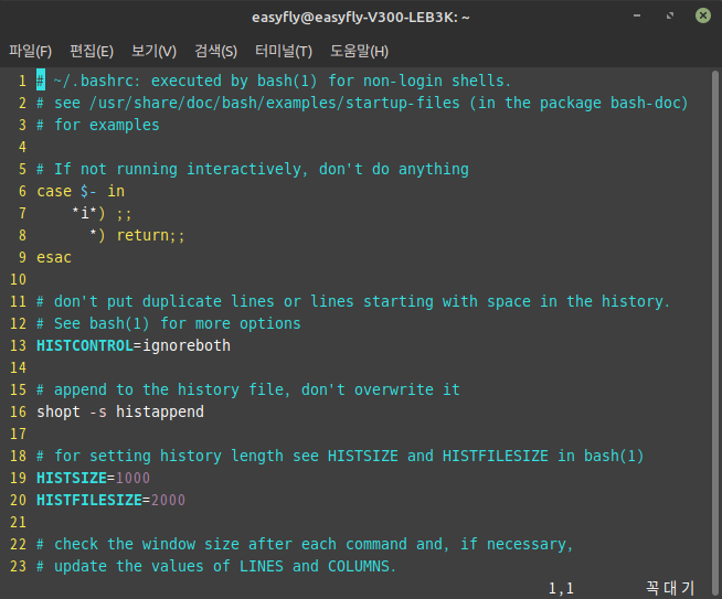 - HISTSIZE와 HISTFILESIZE: 각각 메모리와 파일에 저장할 히스토리 명령어의 개수를 설정합니다.