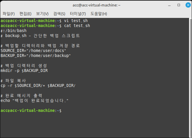 위의 예시는 간단한 백업을 수행하는 셸 스크립트로, 특정 디렉터리의 내용을 백업하고 완료 메시지를 출력하는 작업을 자동화한다. 사용자는 해당 스크립트를 작성한 후 실행할 수 있으며, 여러 번 반복하여 사용할 수 있다.