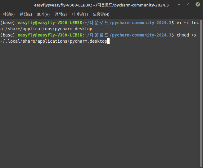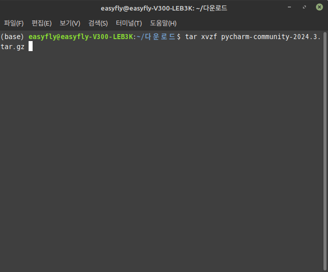 이 명령은 파일의 압축을 해제하고 해당 디렉터리 내에 pycharm-community-2024.3 폴더를 생성합니다.