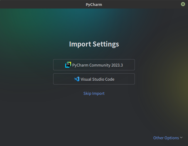 설치 후 첫 화면은 환경 설정을 묻는 창입니다. 기존에 사용한 경우는 제일 위 'PyCharm Community 2023.3'을 선택합니다. 기존 환경과 같은 환경에서 프로그램을 사용할 수 있는 장점이 있습니다.