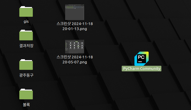 이제 시작 메뉴에서 PyCharm을 검색하거나 바로가기를 통해 실행할 수 있습니다. 또는 바탕화면에 해당 데스크톱 파일을 복사해서 아래와 같이 사용할 수 있습니다.