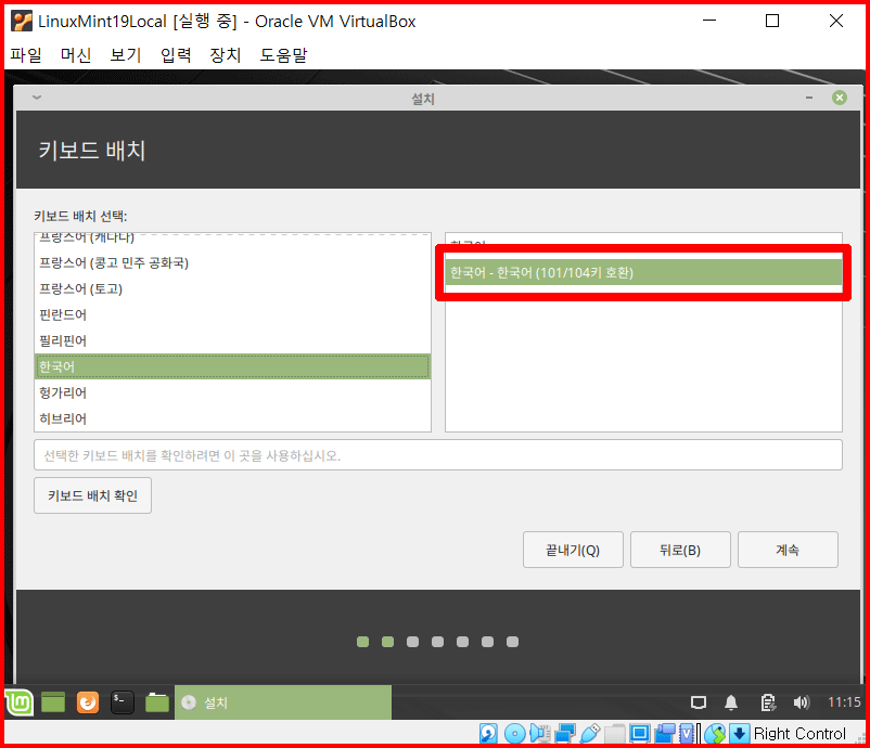 키보드 배치입니다. 104 키보드를 선택합니다.