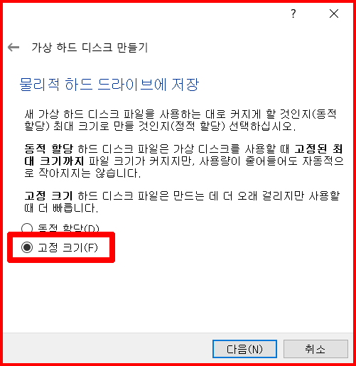 속도가 필요한 실습 과제라면 디스크 크기를 고정하는 것이 좋습니다. 물론 경제적으로는 '동적 할당'이 좋겠으나 커널 컴파일 등을 위해서는 속도가 빠른 '고정 크기'를 선택합니다.