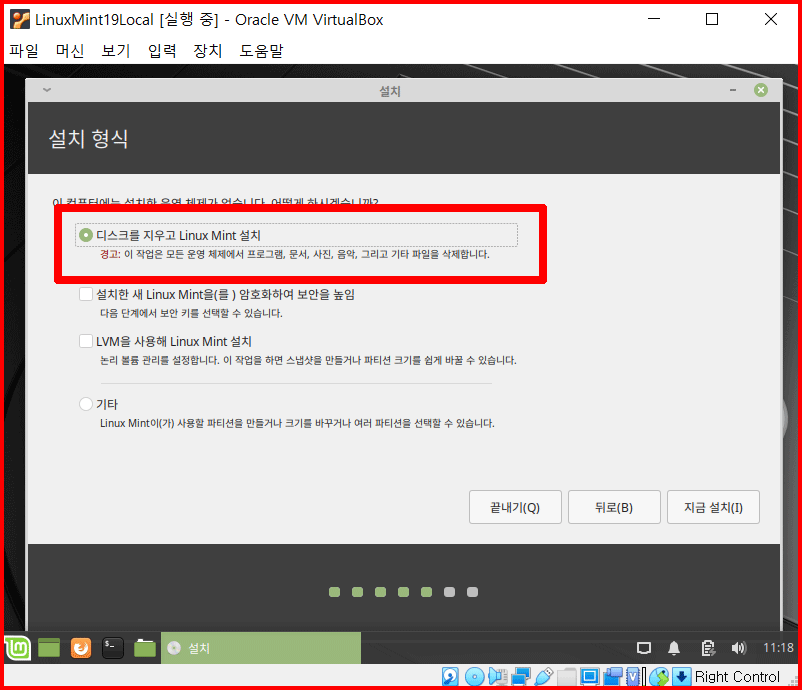가상머신에 리눅스를 설치하기에 여기서는 문제가 안됩니다. 호스트 공간 일부를 가상머신으로 이용하는 것이니까요. 그러나 실제 컴퓨터에 리눅스를 설치한다면 고민이 되는 부분입니다.