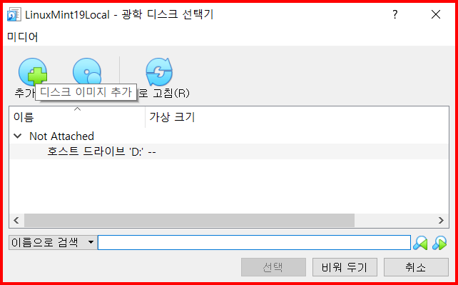 이미지 파일을 사용하는 경우와 광디스크를 사용하는 것은 경우가 다릅니다. 호스트의 저장소를 공유하여 부팅을 할 수 있습니다. 저의 경우는 이미 만들어진 디스크를 호스트 컴퓨터 DVD 드라이브에 넣고 시작을 했습니다.