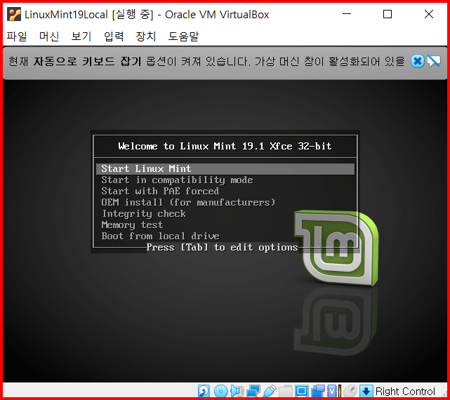 시동디스크의 메뉴 중 'Start Linux Mint' 선택합니다. 이것이 기본 옵션입니다.