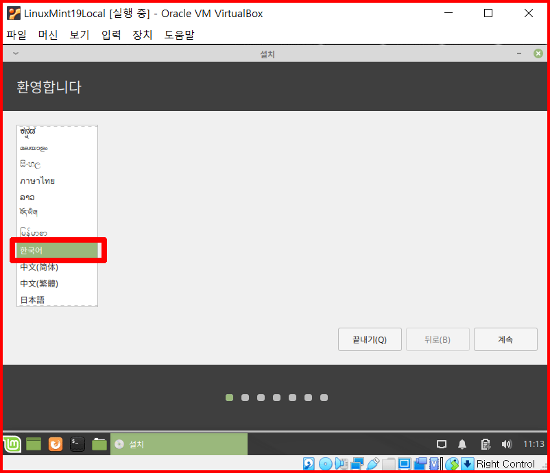 설치 언어를 선택합니다. '한국어'가 아래쪽에 있네요.