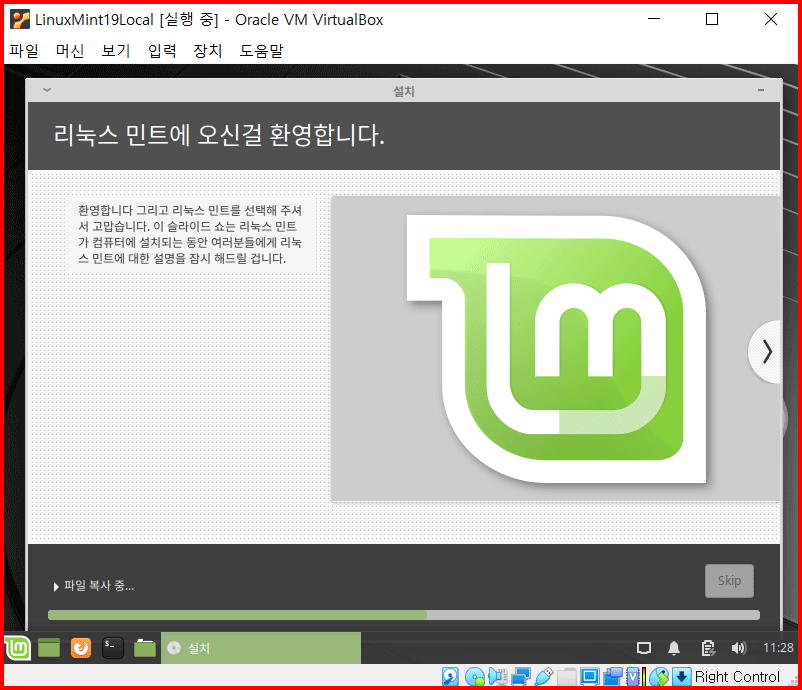 '리눅스 민트에 오신 걸 환영합니다.' 멘트가 나오면서 설치됩니다. 설치 과정은 윈도우즈10 설치보다 쉽습니다.