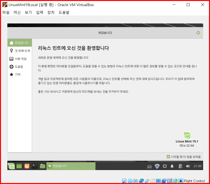 '리눅스 민트에 오신 것을 환영합니다.' 새로운 운영 체제에 오신 것을 환영하는 배너가 뜨면서 리눅스 세계의 시작을 알립니다.