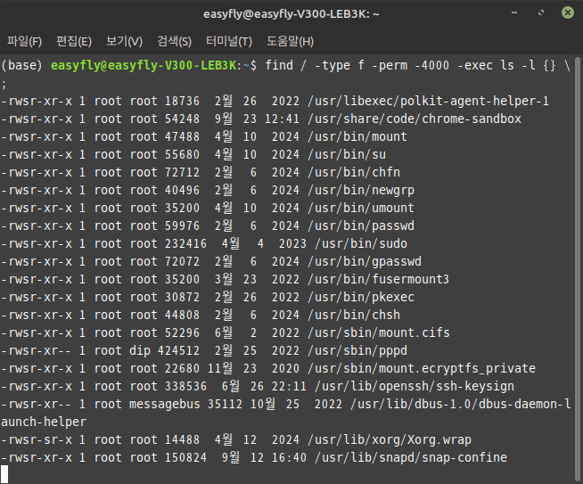 - Set-UID 비트가 설정되어 있고, 추가 권한을 포함하는 파일(예: 4755, 4555 등)도 검색됩니다.