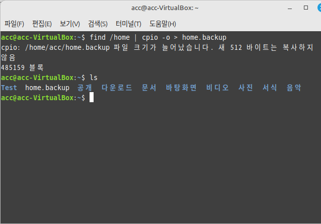 위 명령어는 /home 아래의 파일 목록을 받아 백업 파일로 저장합니다.find /home | cpio -o > home.backup