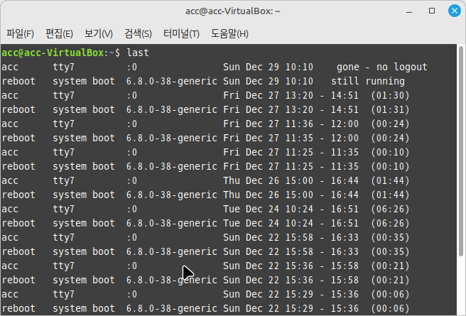 다음 중 재부팅(reboot)한 기록을 가장 쉽게 확인할 수 있는 명령으로 알맞은 것은?