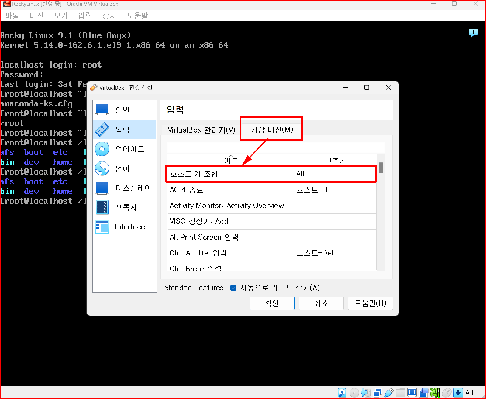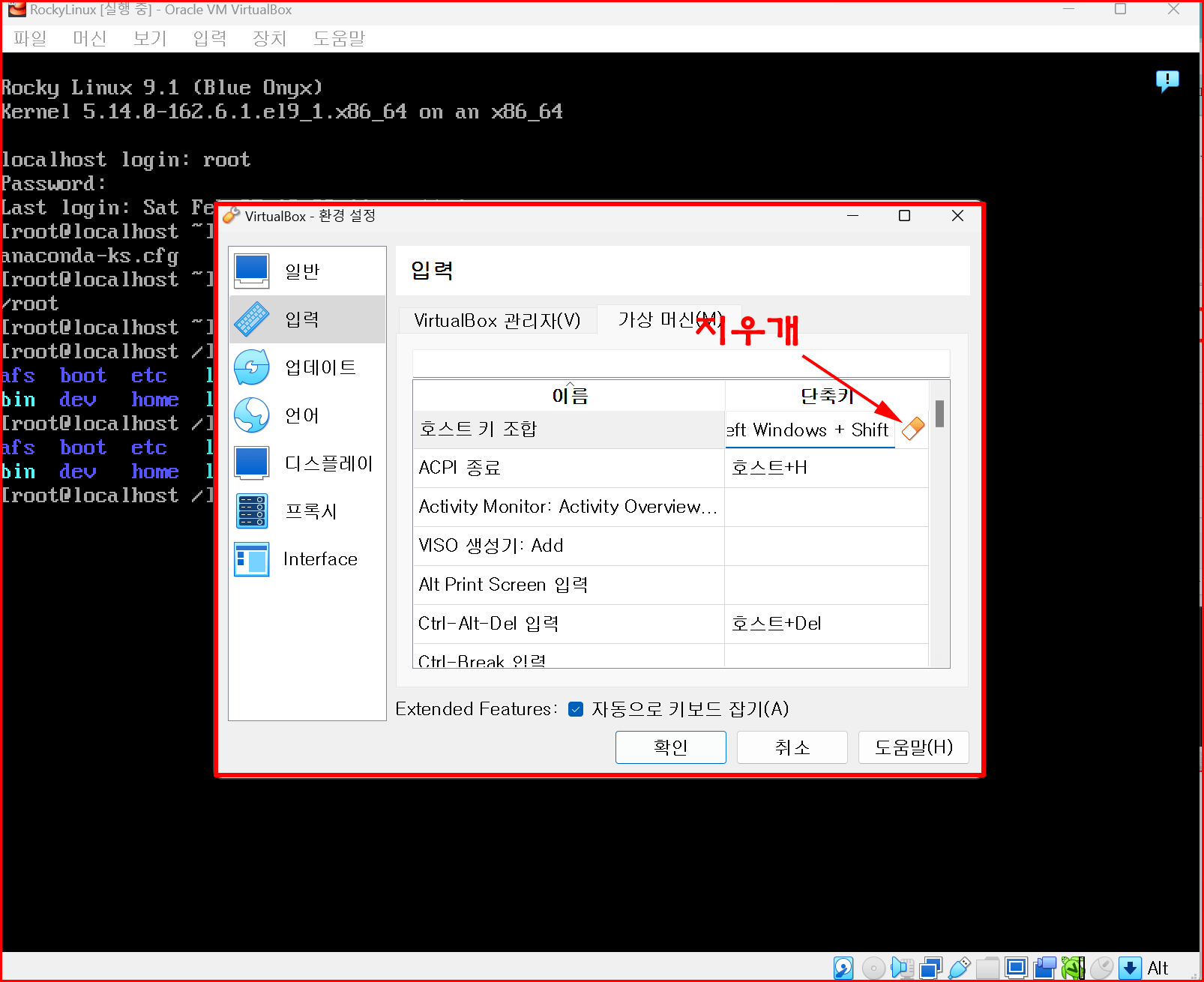 호스트 키란 호스트 운영체제로 빠져나오는 키입니다. 윈도 운영체제 기반에 버추얼박스를 설치하고 리눅스를 깔았다면 윈도가 Host고 리눅스는 Guest가 됩니다.
