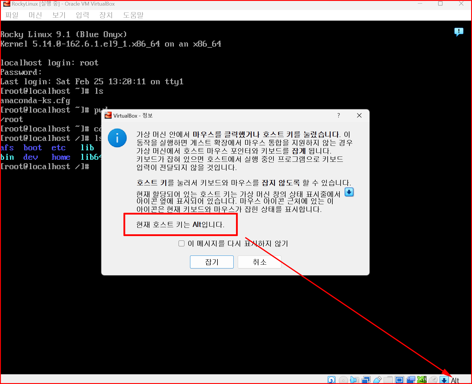 호스트 키에 대한 정보는 다음과 같은 알림 창에서 확인할 수 있습니다. 가상 머신 사용 중에 호스트 키를 눌렀을 때 나타나는 알림 창입니다. 호스트 키의 상태 표시는 버추얼박스 우하단의 파란 바탕의 아래 화살표 오른쪽에 있습니다. 아래 경우는 'Alt' 키라는 것을 알려주네요.